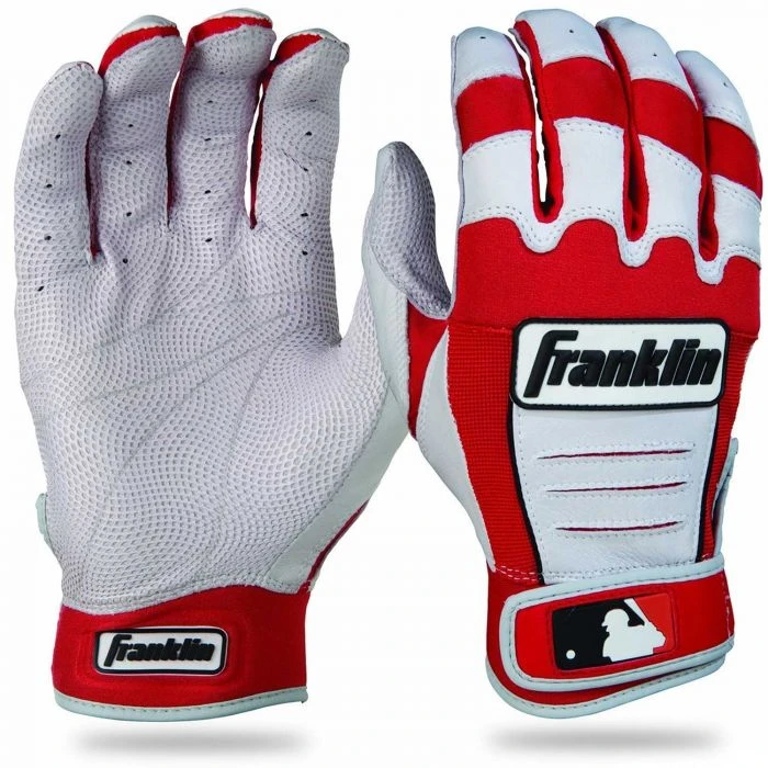 The Franklin CFX Pro Series Baseball Batting Gloves are worn by the most Franklin Pros in the majors today including stars like Paul Goldschmidt, Justin Turner, Ronald Acuna Jr., and Gary Sanchez. These major league gloves are designed to improve performance and increase grip on any bat in all weather conditions. Made with PITTARDS DIGITAL sheepskin leather the CFX Pro Series batting glove provide long-lasting softness and tactility. Find the perfect color to match your team’s colors from our extensive collection of custom batting gloves. Floating thumb technology increases glove flexibility and adaptability Dual-layered lycra-flex bridge provides lightweight flexibility across the knuckle back and side-flex areas Tectonic fit inserts accommodate flex without adding bulk to the back of the hand PITTARDS® DIGITAL® sheepskin leather maintains softness and tactility in all conditions QUAD-FLEX creasing decreases material buildup between your hand and the bat handle One-piece leather palm maintains superior grip, and provides a smooth, seamless feel on any bat