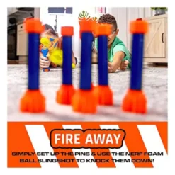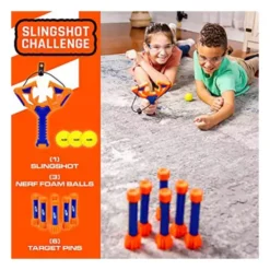 - FIRE AWAY: The NERF Slingshot Challenge game set is the perfect toy for family fun! Simply set up the pins and use NERF foam ball slingshot to knock them down!